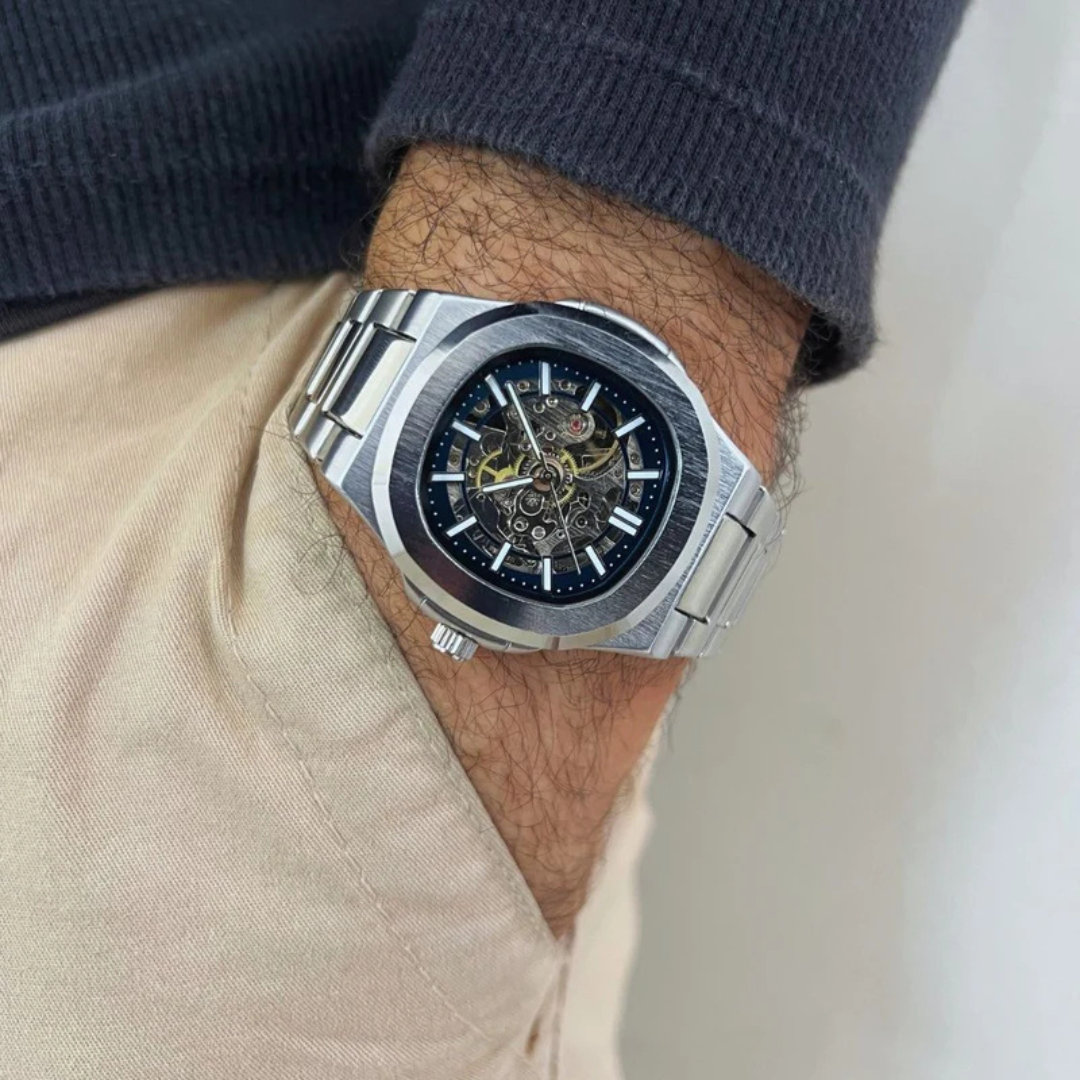 Seu design com mostrador esqueleto revela o funcionamento interno do mecanismo automático, transformando cada movimento em uma expressão de precisão e engenharia.